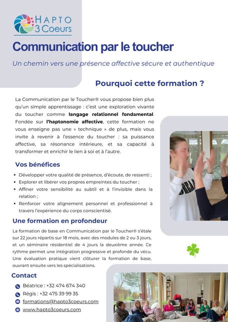 Cette journée vise à vous permettre de découvrir la Communication par le toucher et les caractéristiques du cursus