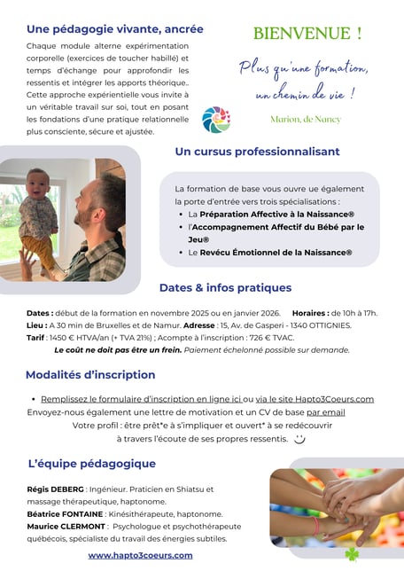 Elle vous ouvre aussi l'accès aux formations professionnalisantes issues de l'haptonomie dans l’accompagnement des liens d’attachement affectifs parents-bébé en pré, et en postnatal, ainsi qu'en